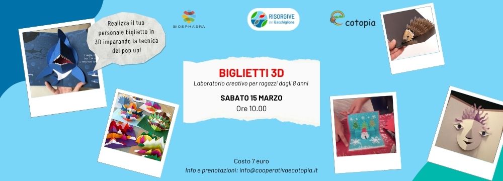 Sabato 15 marzo un altro incontro della rassegna “Manitù – Un mondo di carta”: questa volta creeremo un biglietto in 3D, apprendendo la tecnica del pop-up 💥☀️ Le iscrizioni sono aperte, scrivi a info@cooperativaecotopia.it, vi aspettiamo!
