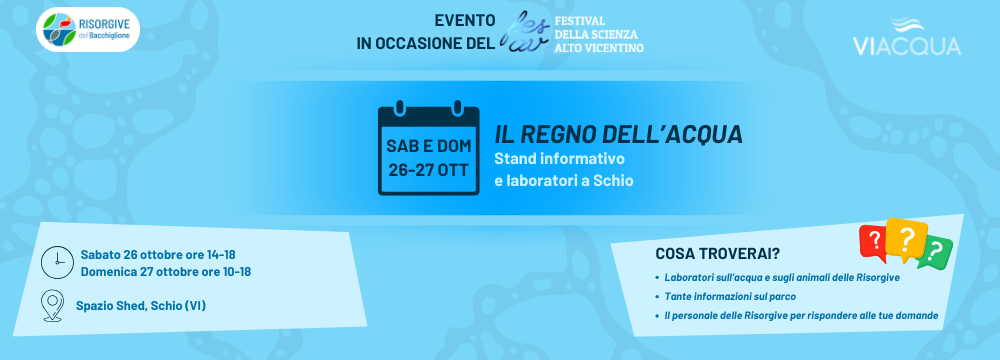 Sabato 26 ottobre (h 14 – 18) e domenica 27 ottobre (h 10 – 18) ci troverete allo Spazio Shed di Schio in occasione del FESAV, con tante informazioni sul parco e alcuni laboratori creativi e scientifici sul tema dell’acqua. Vi aspettiamo! 💧🦆