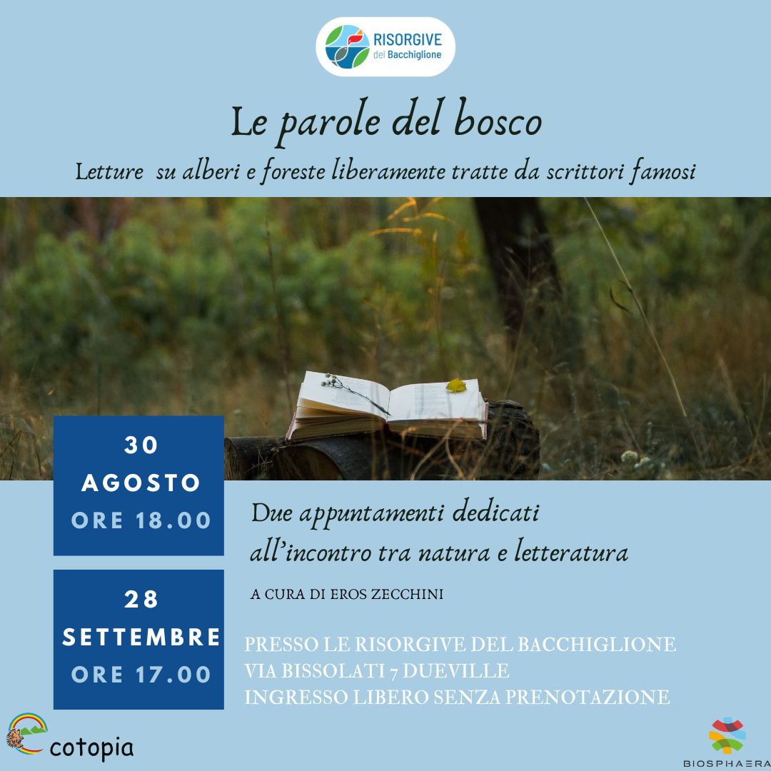 Tra agosto e settembre due magici appuntamenti alle Risorgive del Bacchiglione: le letture ad alta voce a cura di Eros Zecchini ci trasporteranno in mezzo alla natura attraverso le parole di alcuni scrittori famosi. ☀️🍃