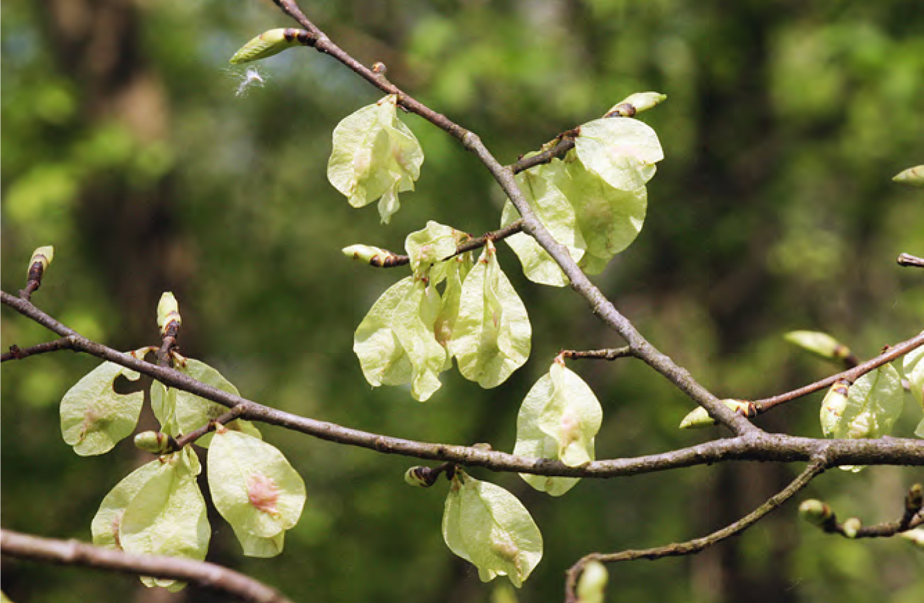 L’olmo campestre è un albero assai longevo, che può raggiungere grandi dimensioni (anche oltre 30 m di altezza). Le foglie hanno la caratteristica di essere nettamente asimmetriche alla base. I fiori dell’olmo compaiono prima delle foglie. Nelle figure si possono osservare i frutti – a fogliazione non ancora avvenuta – e le foglie in estate, con la corteccia sullo sfondo.
