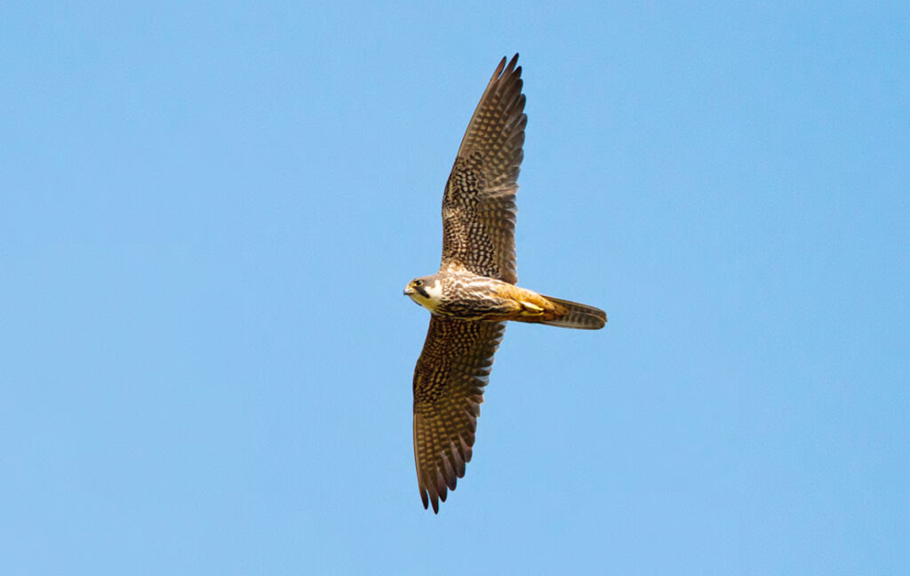 Agili e leggeri, i falchi si possono vedere volare con una certa facilità. Si distinguono dalla Poiana e dallo Sparviere principalmente per le loro lunghe ali appuntite e per la coda stretta e lunga. Mentre la Poiana spesso veleggia, i falchi hanno un volo battuto, con colpi d’ala lunghi e potenti. Vedendoli da lontano, per un non esperto, il loro riconoscimento non è immediato se ci si basa sulla forma e sulla colorazione (anche se estremamente differenti non sono caratteristiche che balzano all’occhio). Ci sono però alcune differenze di comportamento e di scelta dell’habitat, che troverete nei paragrafi successivi, che aiuteranno a capire chi state osservando. Un rapace in volo libero, agile e veloce, nella penombra del tramonto, è quasi certamente un Lodolaio.