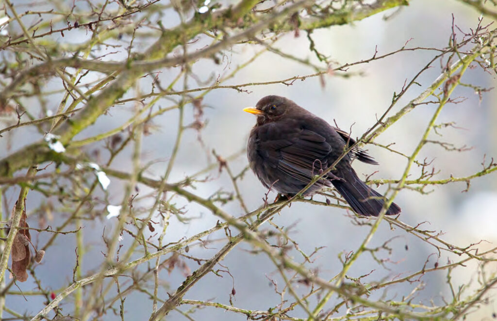 Inconfondibile, il tipico frequentatore di parchi e giardini è l’ubiquitario Merlo. Il maschio ha il piumaggio completamente nero ed un becco giallo-arancio smagliante. La femmina invece, per necessità di mimetismo, ha colori più smorzati, sul grigio-bruno, ed il becco scuro. Per dovere di precisione è da ammettere l’occasionale presenza di individui maschi dai colori intermedi che vengono a confondere le certezze acquisite ma, per gli scopi che ci siamo prefissati, possiamo tranquillamente soprassedere.