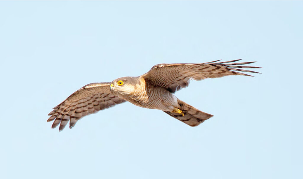 nel fitto della vegetazione e di solito si palesa con volo veloce e improvviso per sparire poco dopo dietro ad una siepe. Se avrete la fortuna di vederlo in volo potrete riconoscerlo dalle ali arrotondate, non appuntite come quelle dei falchi, e dalla lunga coda, stretta e angolosa, meno a ventaglio di quella della Poiana, rispetto alla quale è anche decisamente più piccolo.