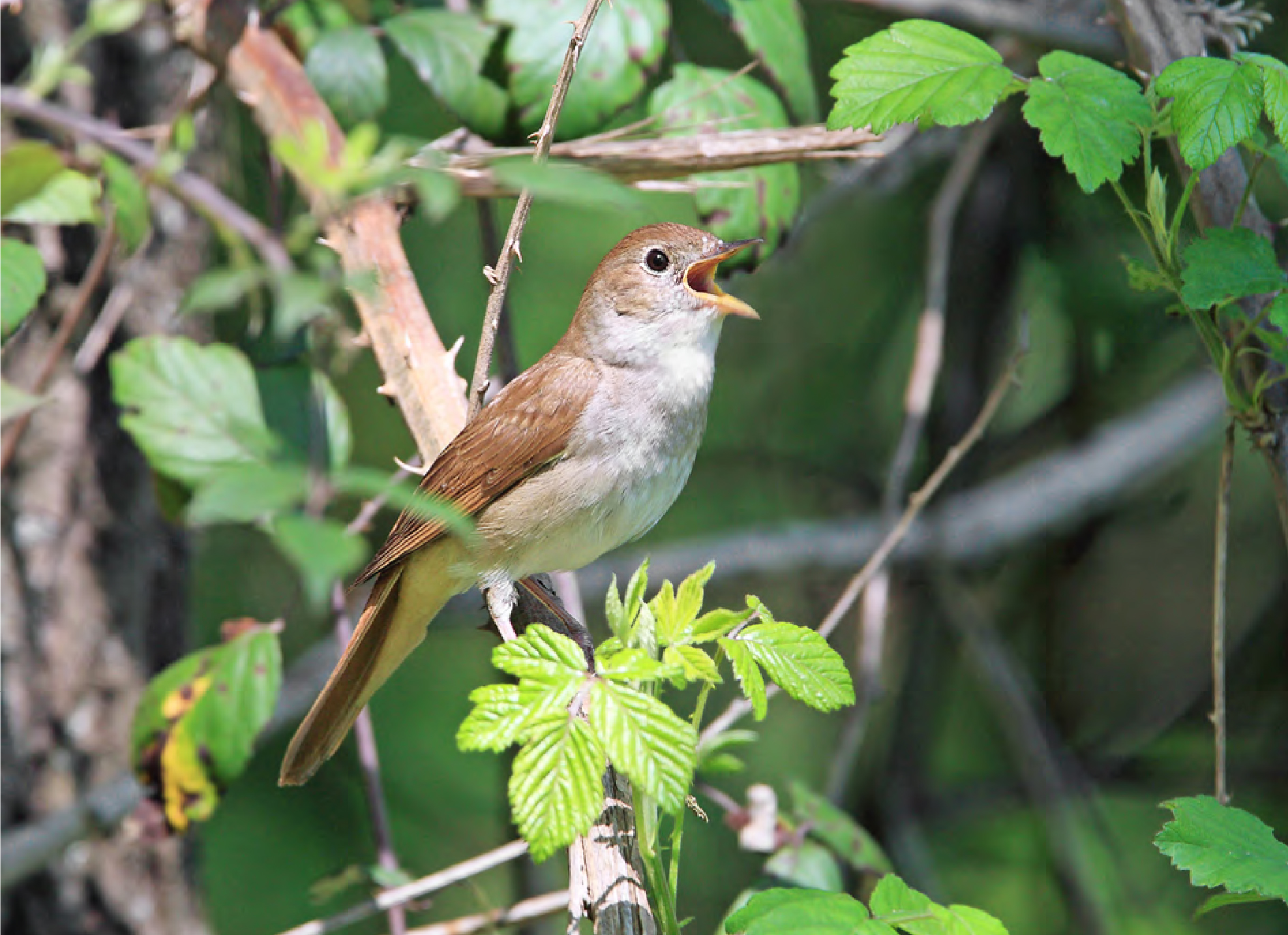 Schivo ed elusivo, sempre nascosto nella vegetazione, l’Usignolo affida alla sua potente voce il compito di proclamare la sua presenza, il suo corteggiamento ed il suo possesso di un territorio. Nelle rare occasioni in cui viene osservato al di fuori del fitto dei cespugli si può notare la coda rossastra che contrasta con il corpo dai colori castani. Non va però confuso con il Codirosso (le femmine ed i giovani hanno il corpo dai colori mimetici simili all’Usignolo) ed un buon trucco per riconoscerli è osservare i movimenti della coda: l’Usignolo spesso la tiene sollevata e ferma, il Codirosso bassa e vibrante.